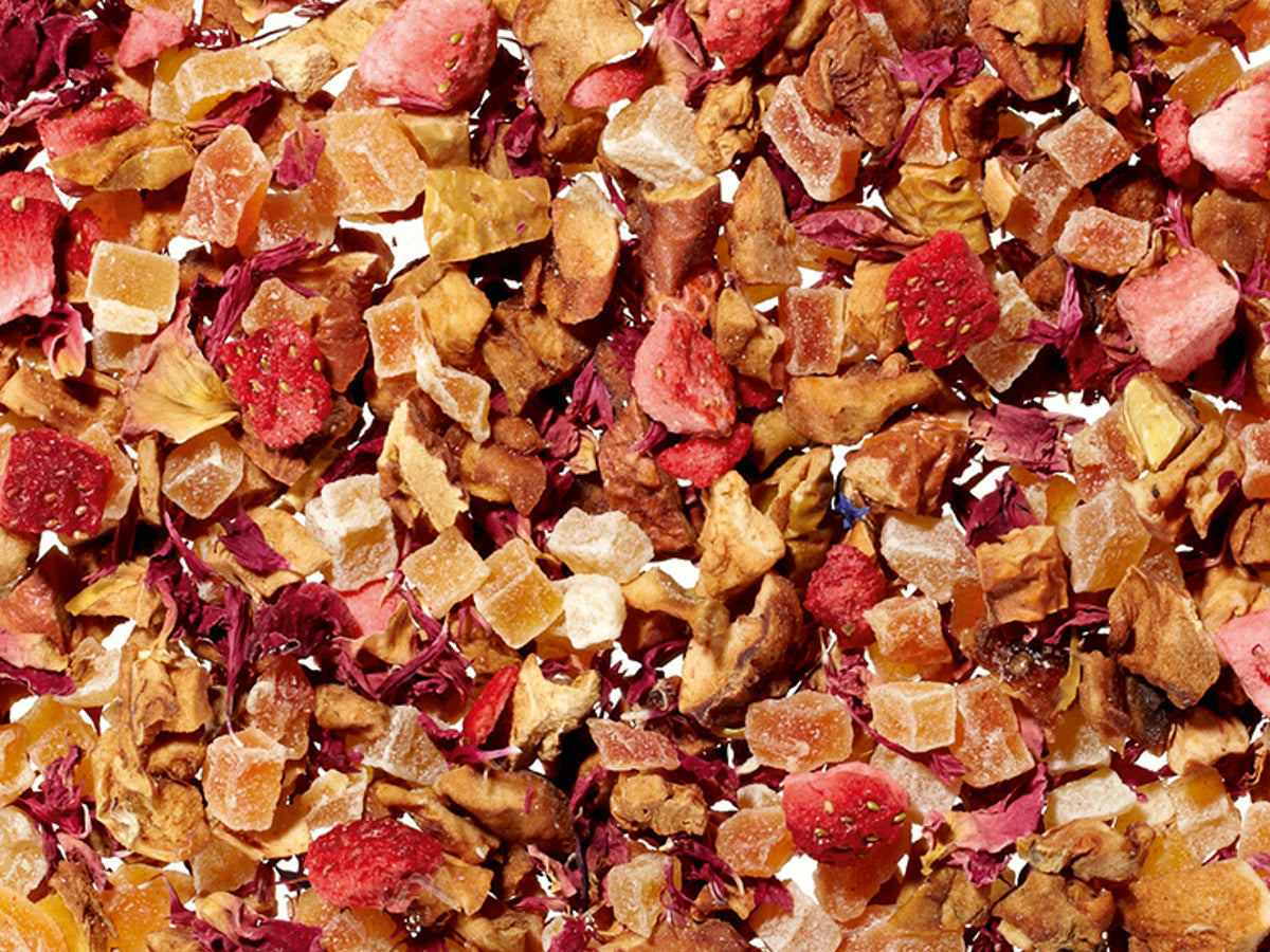 A fruit-forward herbal blend of strawberry, apple, and papaya accented with rose and white cornflower blossom.